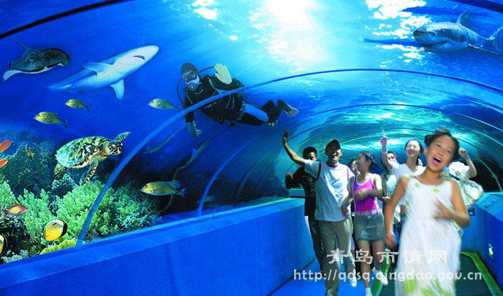 位于青島市市南區(qū)萊陽路2號,毗鄰魯迅公園和第一海水浴場,總建筑面積7300平方米,全部水體約4000立方米,展示幾百個種類、數(shù)千屬活體珍奇海洋生物。主體觀光區(qū)有高7.6米、直徑5米的單體圓柱玻璃展缸,透過寬14.4米、高3.8米、厚25厘米的亞克力玻璃墻,可近距離欣賞“人鯊共舞”的場面。建有開放的海洋實驗室,在“海洋課堂”,還可聆聽專家關(guān)于海洋知識的講解。