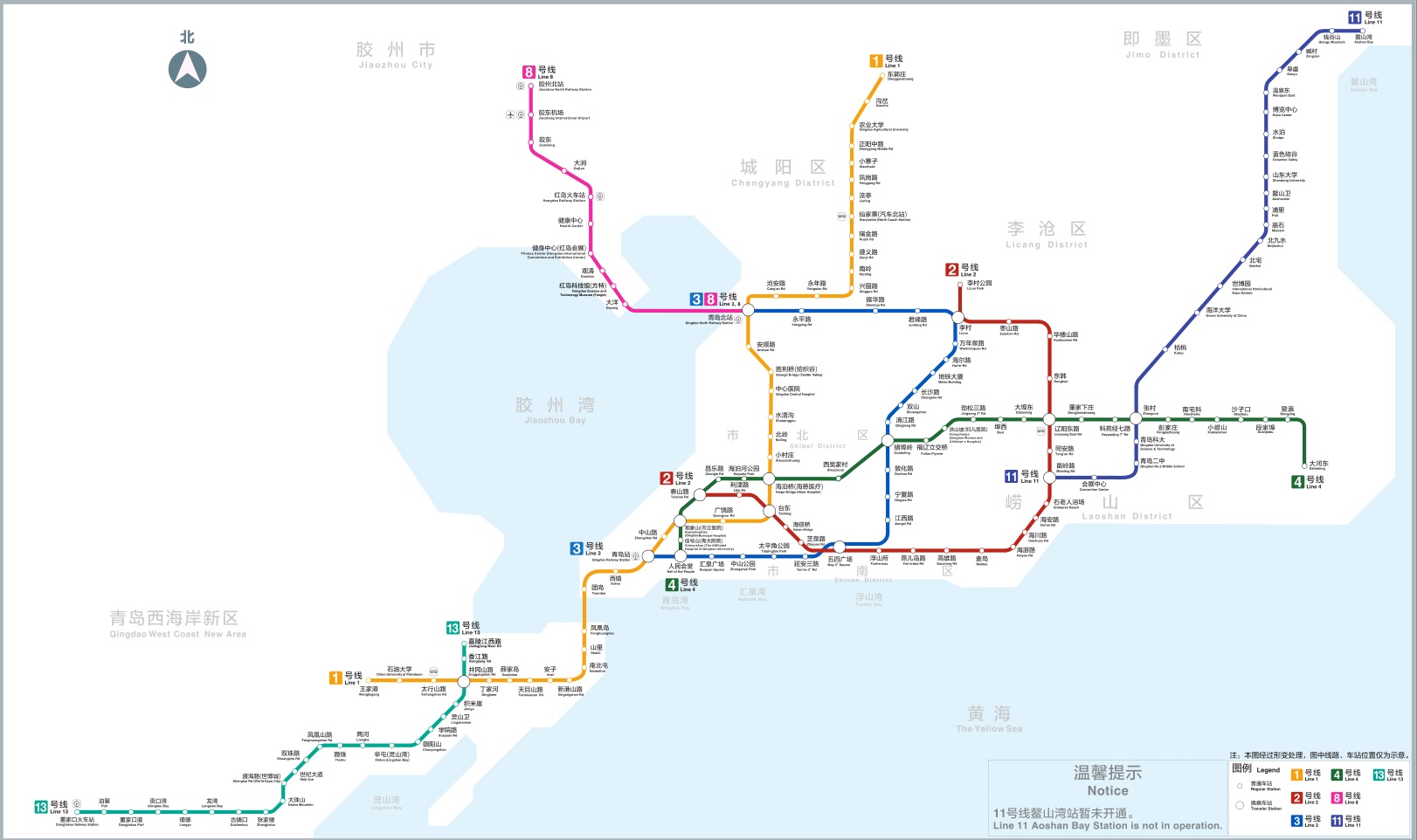 青島地鐵已開通運營線路7條,共設車站151座(含暫未開通的鰲山灣站,換乘站不重復計入),其中青島地鐵1號線(含7號線一期),共設車站41座;青島地鐵2號線一期,共設車站22座;青島地鐵3號線,共設車站22座;青島地鐵4號線,共設車站25座;青島地鐵8號線北段,共設車站11座;青島地鐵11號線,共設車站22座(含暫未開通的鰲山灣站);青島地鐵13號線,共設車站23座(青島地鐵線網(wǎng)圖見下圖)。
