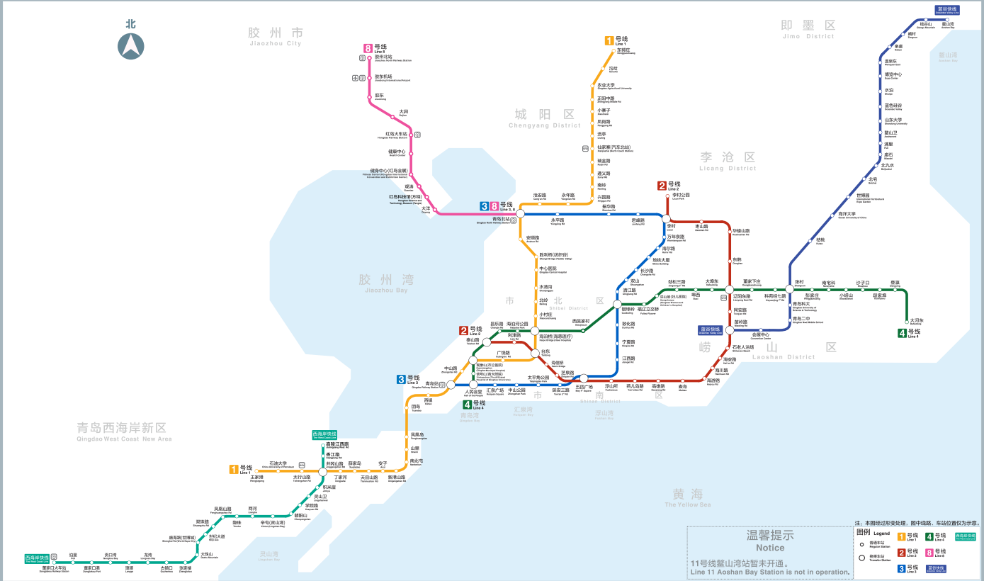 青島地鐵已開通運營線路7條,共設(shè)車站151座(含暫未開通的鰲山灣站,換乘站不重復(fù)計入),其中青島地鐵1號線(含7號線一期),共設(shè)車站41座;青島地鐵2號線一期,共設(shè)車站22座;青島地鐵3號線,共設(shè)車站22座;青島地鐵4號線,共設(shè)車站25座;青島地鐵8號線北段,共設(shè)車站11座;藍谷快線,共設(shè)車站22座(含暫未開通的鰲山灣站);西海岸快線,共設(shè)車站23座(青島地鐵線網(wǎng)圖見下圖)。