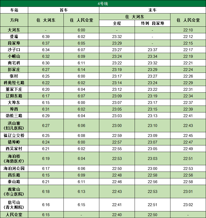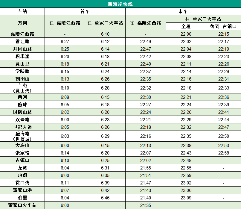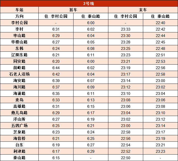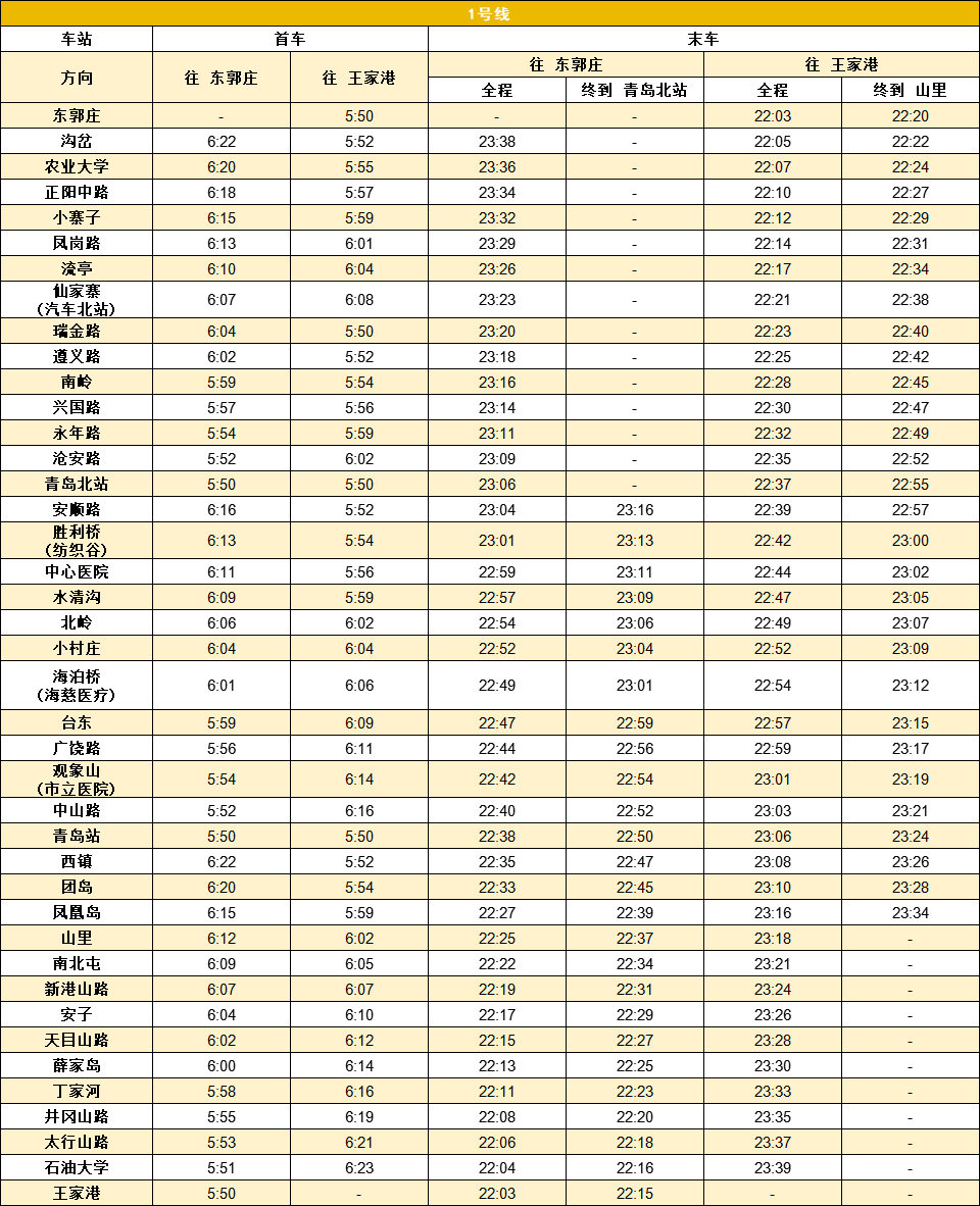 青島地鐵1號線運營時間17.85小時、2號線運營時間17.57小時、3號線運營時間17.43小時、4號線運營時間17.63小時、8號線運營時間17.45小時,藍谷快線運營時間17.20小時、西海岸快線運營時間17.23小時(各線路首末班車時刻見下圖)。