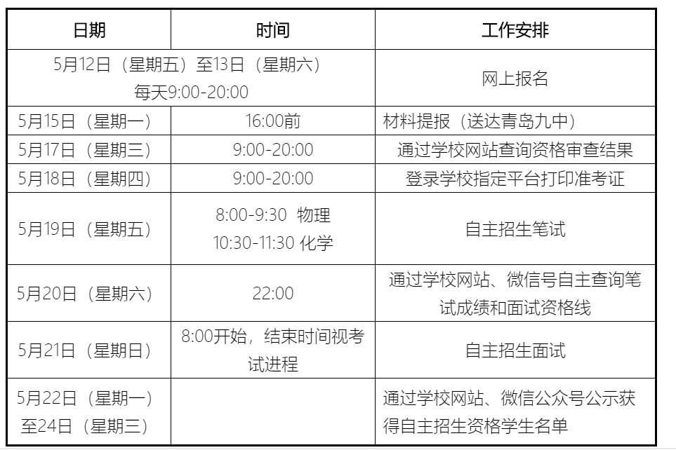符合條件的考生于5月12日(星期五)至5月13日(星期六)每天9:00至20:00登錄青島九中報名平臺(http://www.qdedu.top/jiuzhong),完成自主招生報名。提交成功后,打印報名系統(tǒng)自動生成的《青島九中2023年青西新區(qū)自主招生報名信息表》。