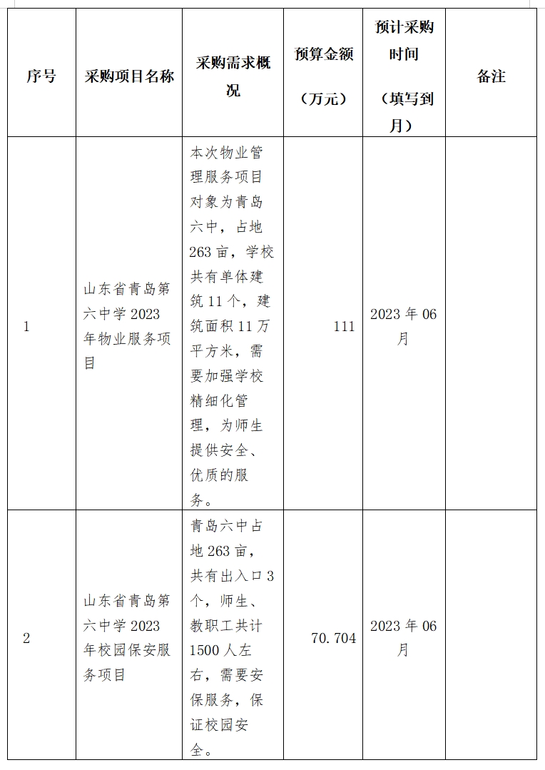 山東省青島第六中學(xué) 2023年06(至)08月政府采購(gòu)意向
