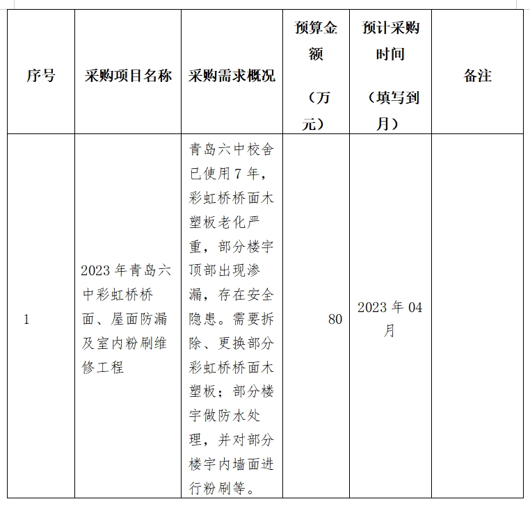 為便于供應(yīng)商及時(shí)了解政府采購(gòu)信息,根據(jù)《財(cái)政部關(guān)于開展政府采購(gòu)意向公開工作的通知》(財(cái)庫(kù)〔2020〕10號(hào))等有關(guān)規(guī)定,現(xiàn)將 山東省青島第六中學(xué)   2023年 04(至)05 月采購(gòu)意向公開如下: