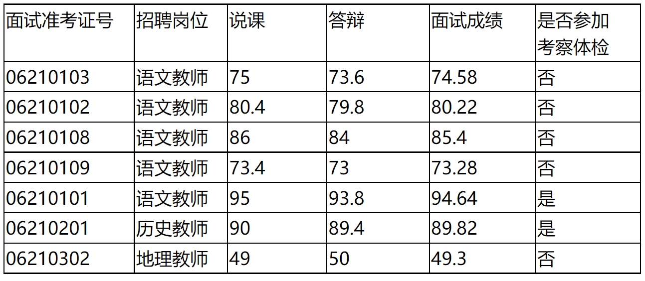 根據(jù)《青島市教育局直屬學(xué)校選聘2021屆優(yōu)秀高校畢業(yè)生簡(jiǎn)章》規(guī)定,現(xiàn)將10月10日招聘崗位面試成績(jī)公布如下:
