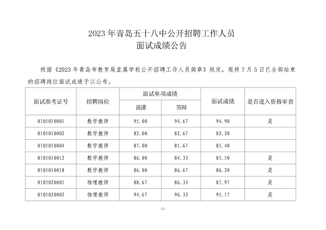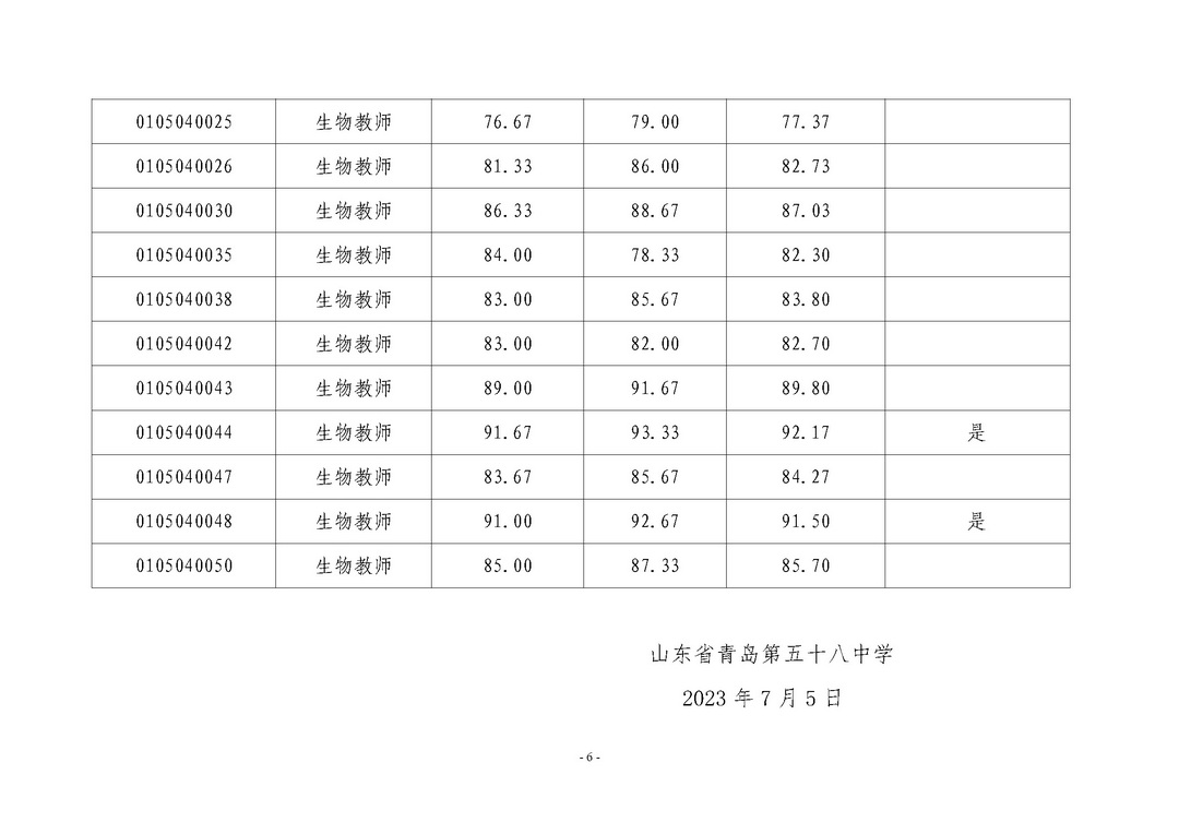 2023年青島五十八中公開招聘工作人員面試成績公告