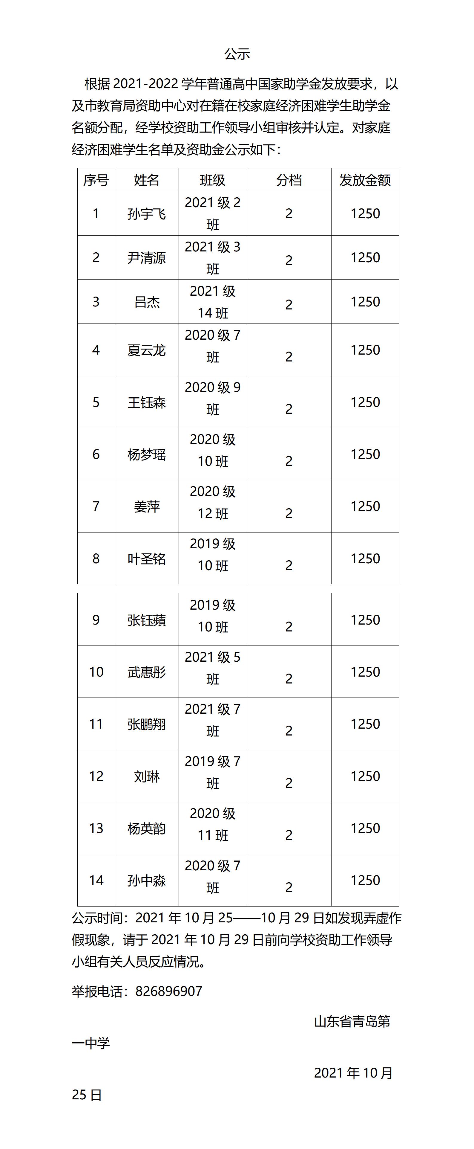 青島一中2021-2022學(xué)年度助學(xué)金發(fā)放公示