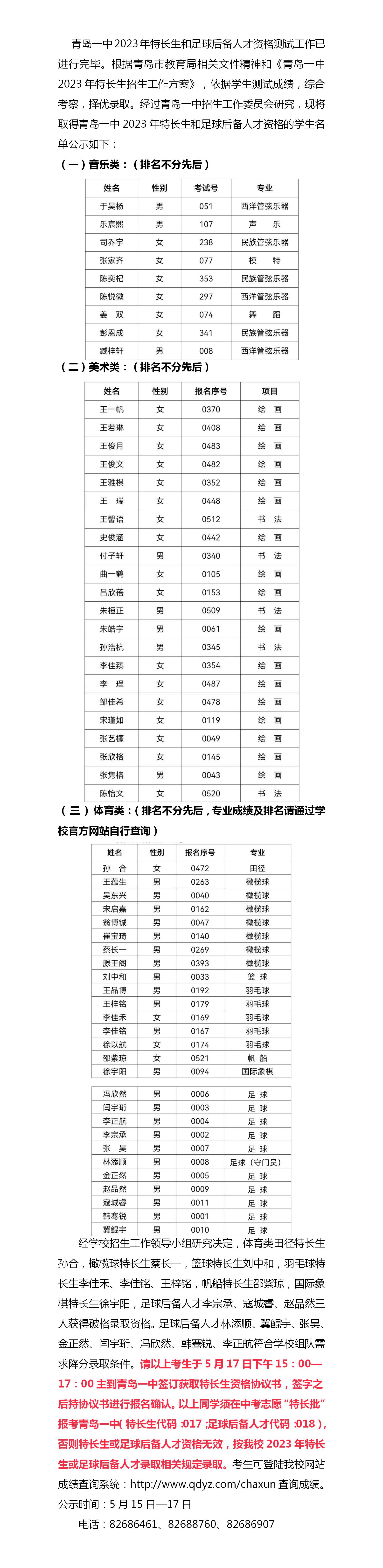 取得青島一中2023年特長(zhǎng)生資格學(xué)生名單公示