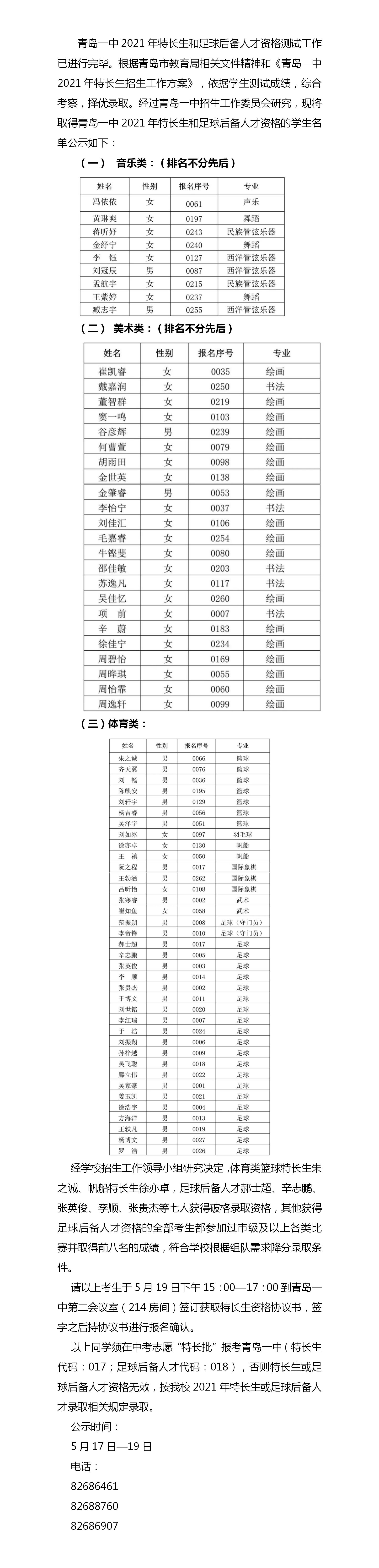 取得青島一中2021年特長(zhǎng)生資格學(xué)生名單公示
