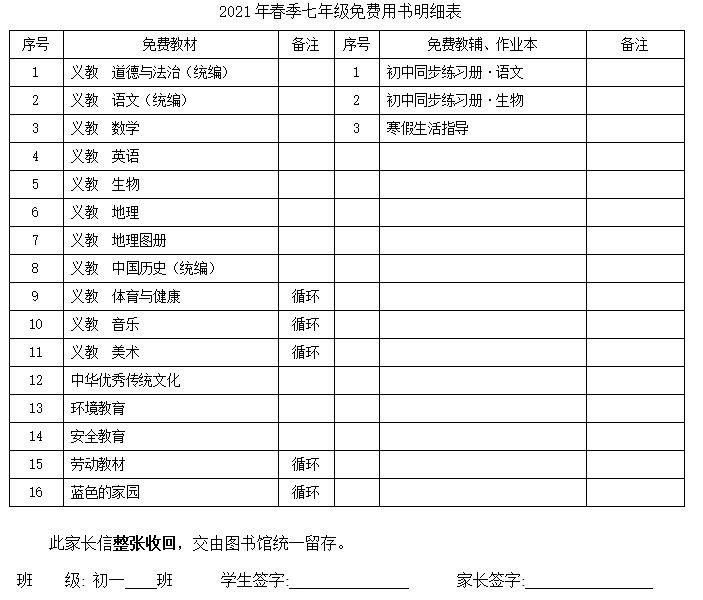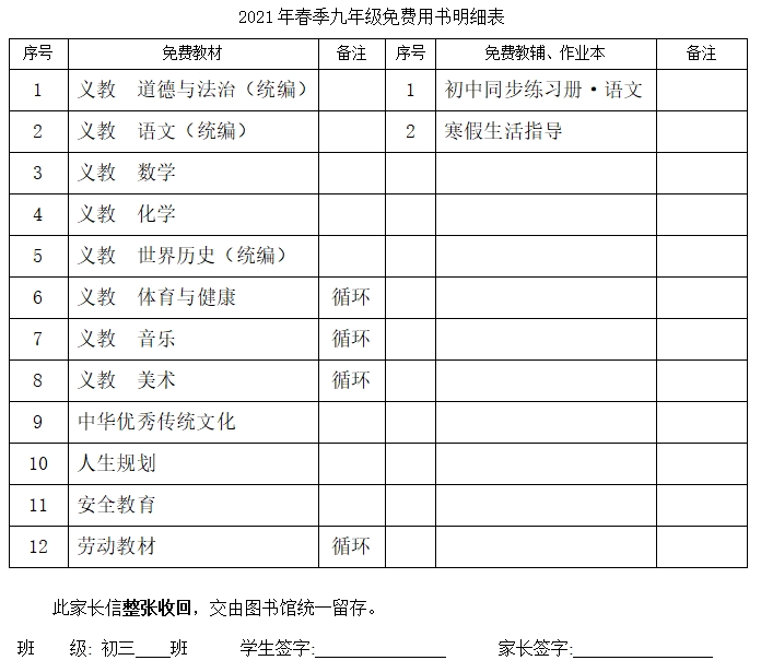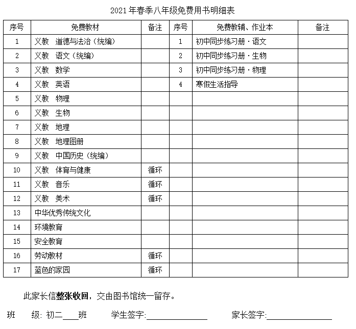 您好!根據(jù)省教育廳《山東省人民政府辦公廳轉(zhuǎn)發(fā)省教育廳等部門(mén)關(guān)于進(jìn)一步加強(qiáng)中小學(xué)教材建設(shè)與管理工作的意見(jiàn)的通知》(魯政辦發(fā)[2008]9號(hào))的相關(guān)通知,免費(fèi)教材、教輔、地方課程明細(xì)如下,請(qǐng)核對(duì)。(因疫情原因,免費(fèi)同步未能發(fā)放,學(xué)校將于近期盡快發(fā)放)