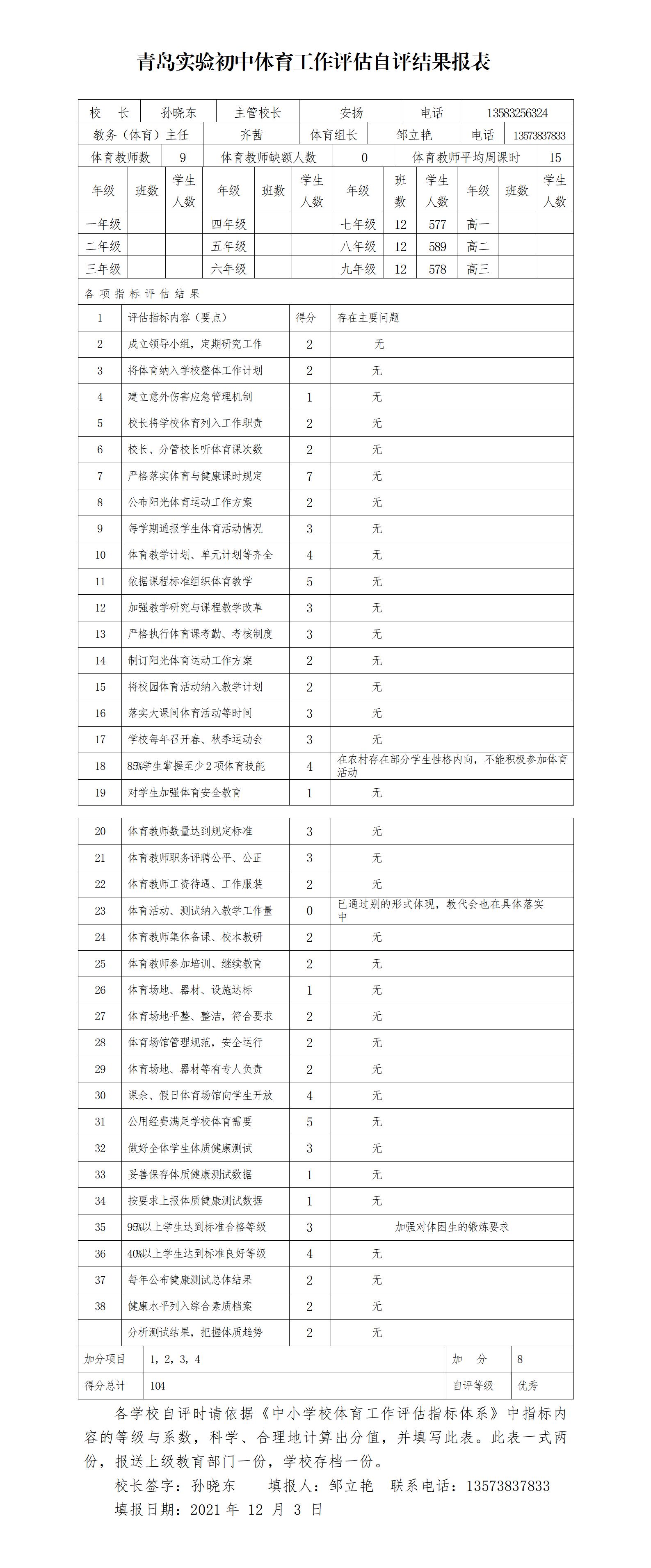 青島實驗初中2021年體育工作評估自評結(jié)果報表