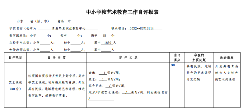 青島華夏職業(yè)學(xué)校2025年中小學(xué)校藝教育工作自評報表