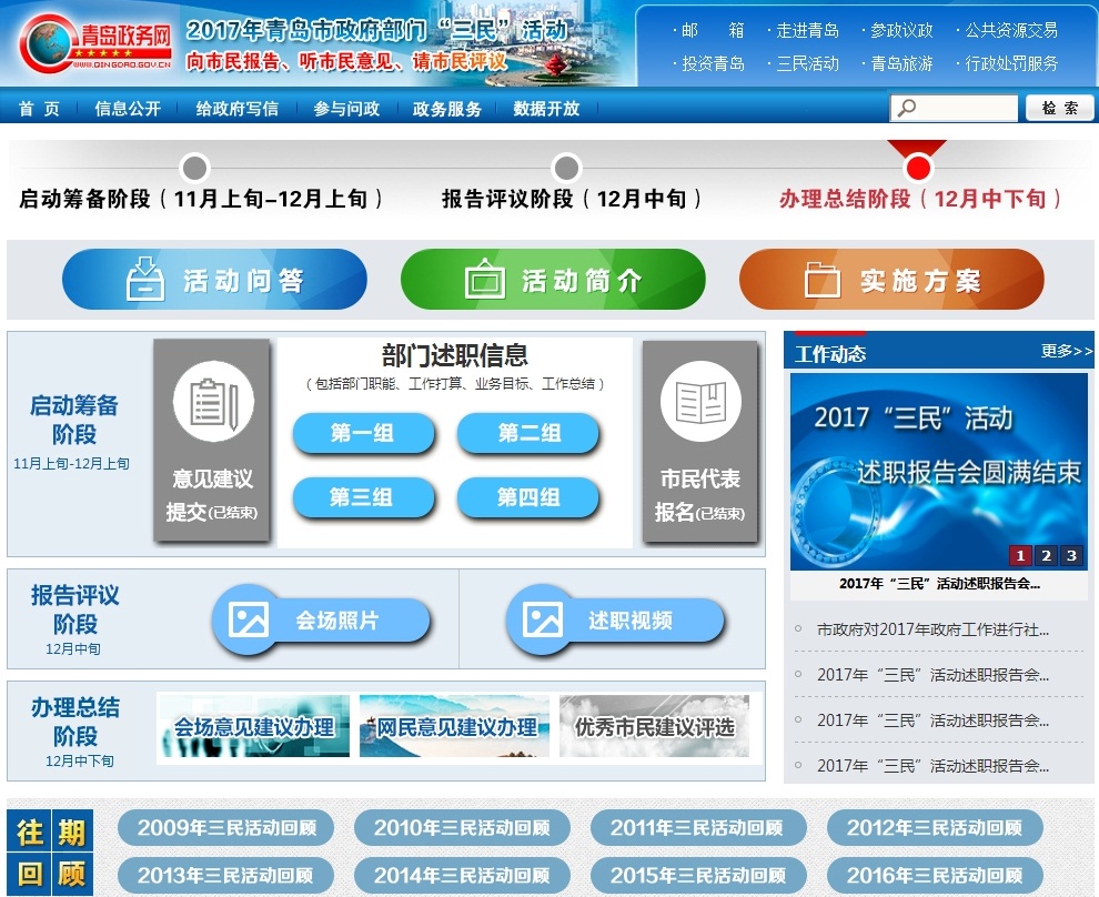 2017年,青島市各級行政機關和有關單位認真貫徹《條例》和國家、省政務公開規(guī)定,堅持以“公開為常態(tài)、不公開為例外”,推進行政行為和政務服務全過程公開,擴大公眾參與,保障人民群眾知情權、參與權、表達權和監(jiān)督權。在中國政法大學法治政府研究院對100個城市政務公開測評中,青島位列第一;在中國軟件評測中心舉辦的第十六屆中國政府網(wǎng)站績效評估中,青島政務網(wǎng)在330多個地級(含副省級)城市中第九次位列第一。