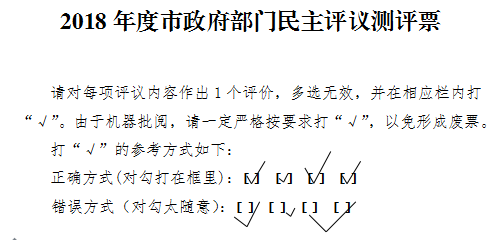 為調(diào)查了解市民代表對市政府部門履行職責的滿意度,請您結(jié)合市政府部門現(xiàn)場述職及平時了解掌握的情況,認真填寫《2018年度市政府部門民主評議測評票》。測評結(jié)果納入2018年市政府部門綜合考核成績。