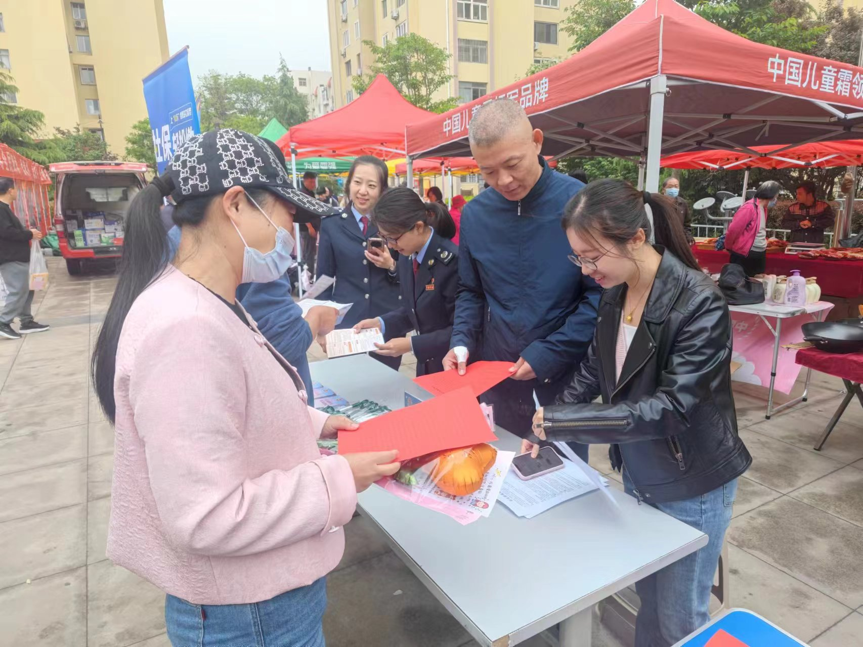 街道工作人員為居民發(fā)放宣傳單頁、政策明白紙