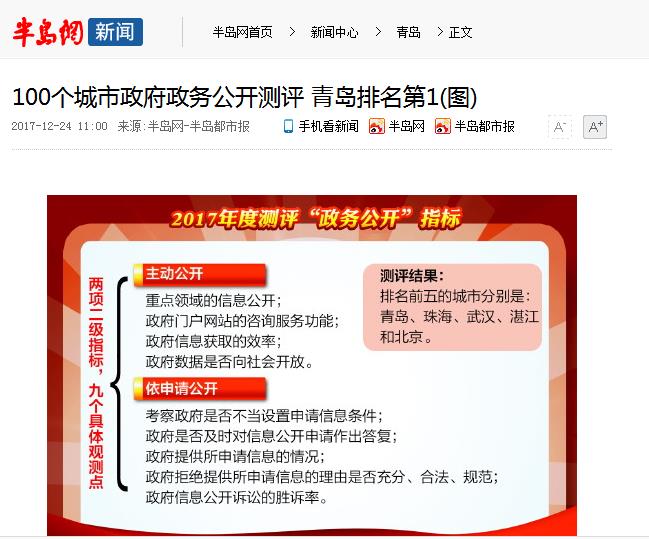 2017年,青島市各級行政機(jī)關(guān)和有關(guān)單位認(rèn)真貫徹《條例》和國家、省政務(wù)公開規(guī)定,堅(jiān)持以“公開為常態(tài)、不公開為例外”,推進(jìn)行政行為和政務(wù)服務(wù)全過程公開,擴(kuò)大公眾參與,保障人民群眾知情權(quán)、參與權(quán)、表達(dá)權(quán)和監(jiān)督權(quán)。在中國政法大學(xué)法治政府研究院對100個(gè)城市政務(wù)公開測評中,青島位列第一;在中國軟件評測中心舉辦的第十六屆中國政府網(wǎng)站績效評估中,青島政務(wù)網(wǎng)在330多個(gè)地級(含副省級)城市中第九次位列第一。