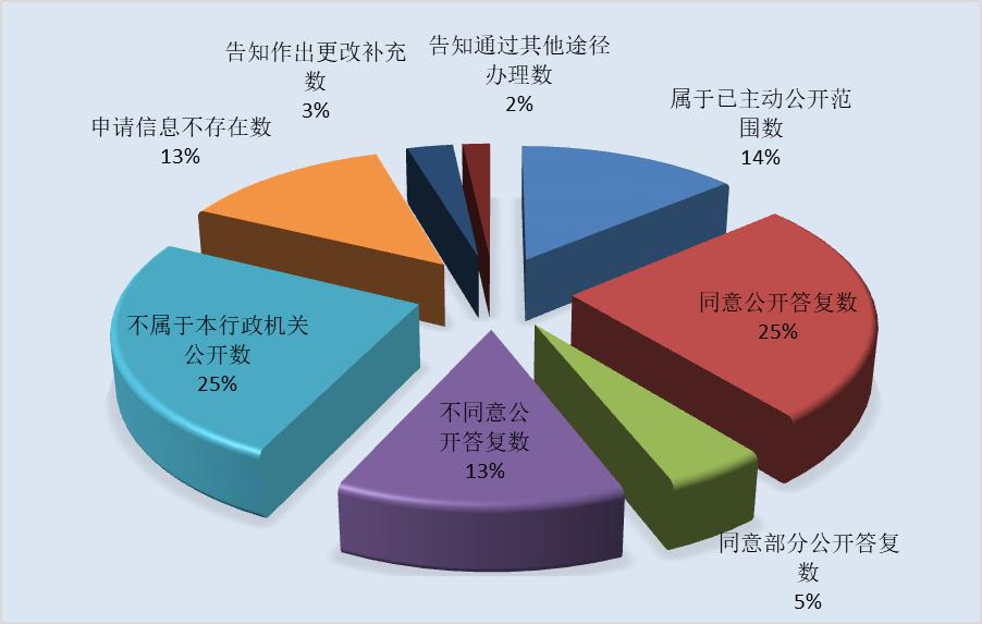 全年受理的6341件政府信息公開申請已全部答復(fù)。其中,屬于已主動(dòng)公開范圍的881件,占答復(fù)總量的13.9%;同意公開1605件,占答復(fù)總量的25.3%;同意部分公開299件,占答復(fù)總量的4.7%;不予公開832件,占答復(fù)總量的13.1%;非本機(jī)關(guān)掌握的1596件,占答復(fù)總量的25.2%;信息不存在、內(nèi)容不明確等其他情況1128件,占答復(fù)總量的17.8%。