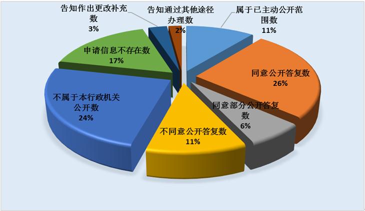 全年受理的3967件政府信息公開申請已全部答復(fù)。其中,屬于已主動(dòng)公開范圍的423件,占答復(fù)總量的10.7%;同意公開1032件,占答復(fù)總量的26%;同意部分公開257件,占答復(fù)總量的6.5%;不予公開434件,占答復(fù)總量的10.9%;非本機(jī)關(guān)掌握的969件,占答復(fù)總量的24.4%;信息不存在、內(nèi)容不明確等其他情況852件,占答復(fù)總量的21.5%。