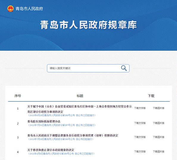 組織各部門梳理信息公開目錄,使目錄設(shè)置更加科學(xué)合理、規(guī)范有序。根據(jù)國(guó)家、省關(guān)于規(guī)章集中公開工作的要求,在青島政務(wù)網(wǎng)開發(fā)建設(shè)了規(guī)章庫(kù),集中統(tǒng)一規(guī)范公開了現(xiàn)行有效的政府規(guī)章,并提供了文字版和圖片版的下載鏈接。