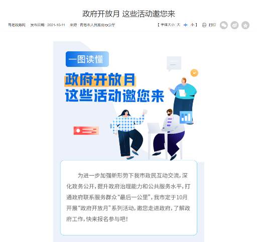三是將10月確定為全市“政府開放月”,大規(guī)模組織開展活動(dòng)210余場(chǎng)次,活動(dòng)覆蓋了城市管理、文化旅游、教育教學(xué)、綜合執(zhí)法、公共企事業(yè)單位等多個(gè)領(lǐng)域,進(jìn)一步加強(qiáng)了新形勢(shì)下政民互動(dòng)交流,深化政務(wù)公開。