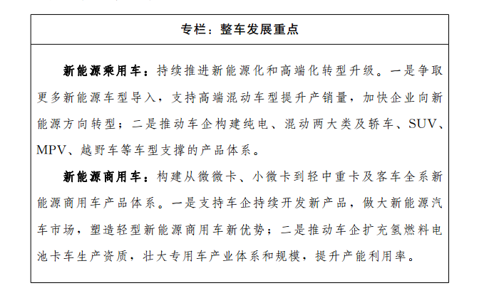 1.乘用車倍增發(fā)展。支持企業(yè)加快暢銷新能源車型的研發(fā)和上市,積極爭(zhēng)取整車企業(yè)在我市布局高端暢銷車型,提升中高端新能源車型產(chǎn)銷量,提高現(xiàn)有整車企業(yè)產(chǎn)能利用率。深化與相關(guān)企業(yè)集團(tuán)聯(lián)系機(jī)制,開展更深層次戰(zhàn)略合作,爭(zhēng)取新整車項(xiàng)目落地。(責(zé)任單位:市工業(yè)和信息化局、市發(fā)展改革委,有關(guān)區(qū)、市政府。以下各項(xiàng)工作均需有關(guān)區(qū)、市政府落實(shí),不再一一列出)