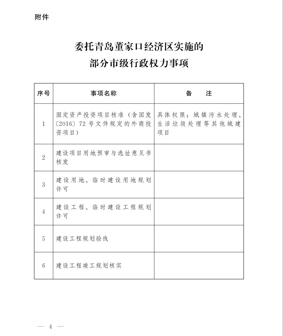 一、委托實施部分市級行政權力事項。將6項市級行政權力事項委托青島董家口經(jīng)濟區(qū)實施。上述行政權力事項中,由國家、省下放給市本級行使的部分,依法不再委托下放。