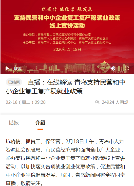 創(chuàng)新政策解讀方式,開展“抗疫情保經(jīng)營 穩(wěn)發(fā)展--支持民營和中小企業(yè)復(fù)工復(fù)產(chǎn)穩(wěn)就業(yè)政策線上宣講活動”,通過線上直播的方式,解讀疫情期間穩(wěn)就業(yè)相關(guān)政策,讓更多企業(yè)了解政策、用好政策。