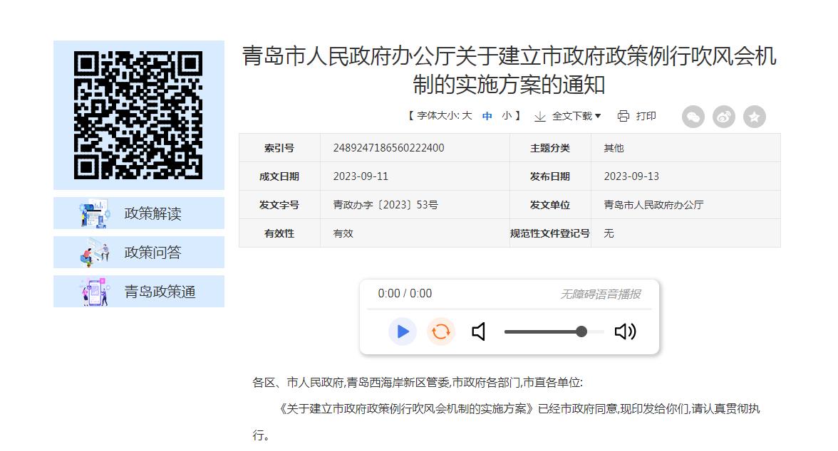 2023年,通過市政府門戶網站、《青島市人民政府公報》等渠道主動公開本年度制發(fā)的市政府規(guī)章6件、市政府及市政府辦公廳行政規(guī)范性文件8件,廢止市政府規(guī)章1件。加大政策解讀力度,對全市各級行政機關政策解讀工作進一步予以規(guī)范。不斷豐富解讀形式,升級政策解讀欄目,多角度對政府文件和會議進行解讀,實現(xiàn)從“一個視角”到“多個視角”,從“紙面難懂”到“動圖秒懂”,從“人找政策”到“政策找人”轉變。全國首創(chuàng)制作發(fā)布如何查找和申請政策系列視頻,在全市范圍內組織開展2023年度優(yōu)秀政策解讀材料評選活動。