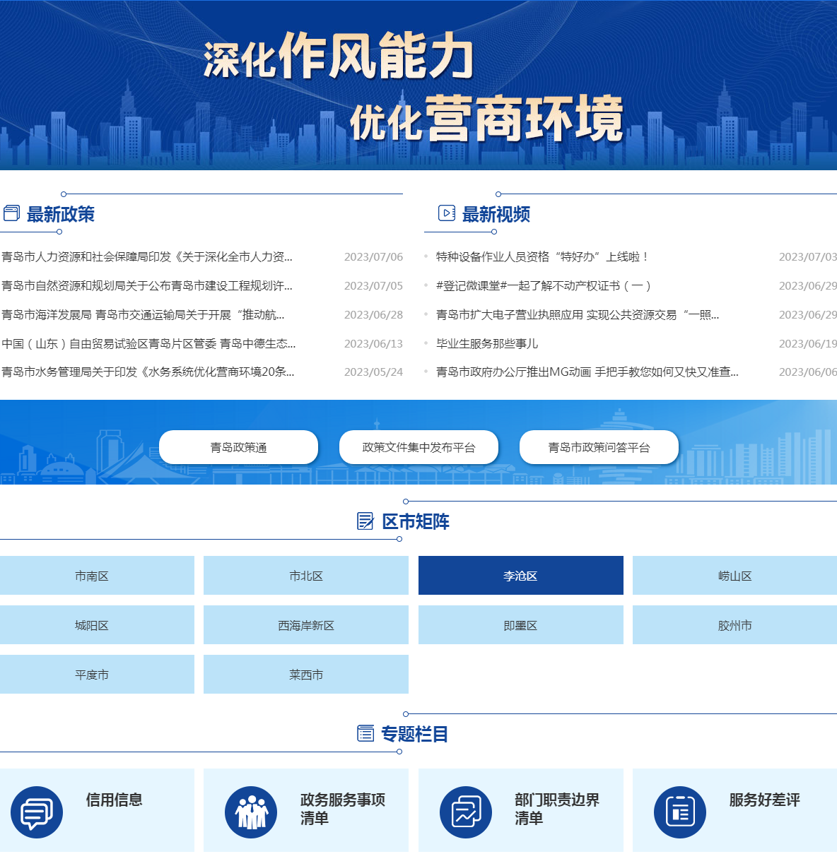 六是開設“優(yōu)化營商環(huán)境”專題專欄。設置“最新政策”“最新視頻”“區(qū)市矩陣”“專題欄目”四個欄目,整合發(fā)布各區(qū)(市)、各部門優(yōu)化營商環(huán)境方面的政策文件、政策解讀、視頻動畫等內容,多角度、多層次、全面生動地向企業(yè)和群眾呈現(xiàn)近年來我市優(yōu)化營商環(huán)境的政策措施和特色亮點,發(fā)布信息690余條,視頻97條。