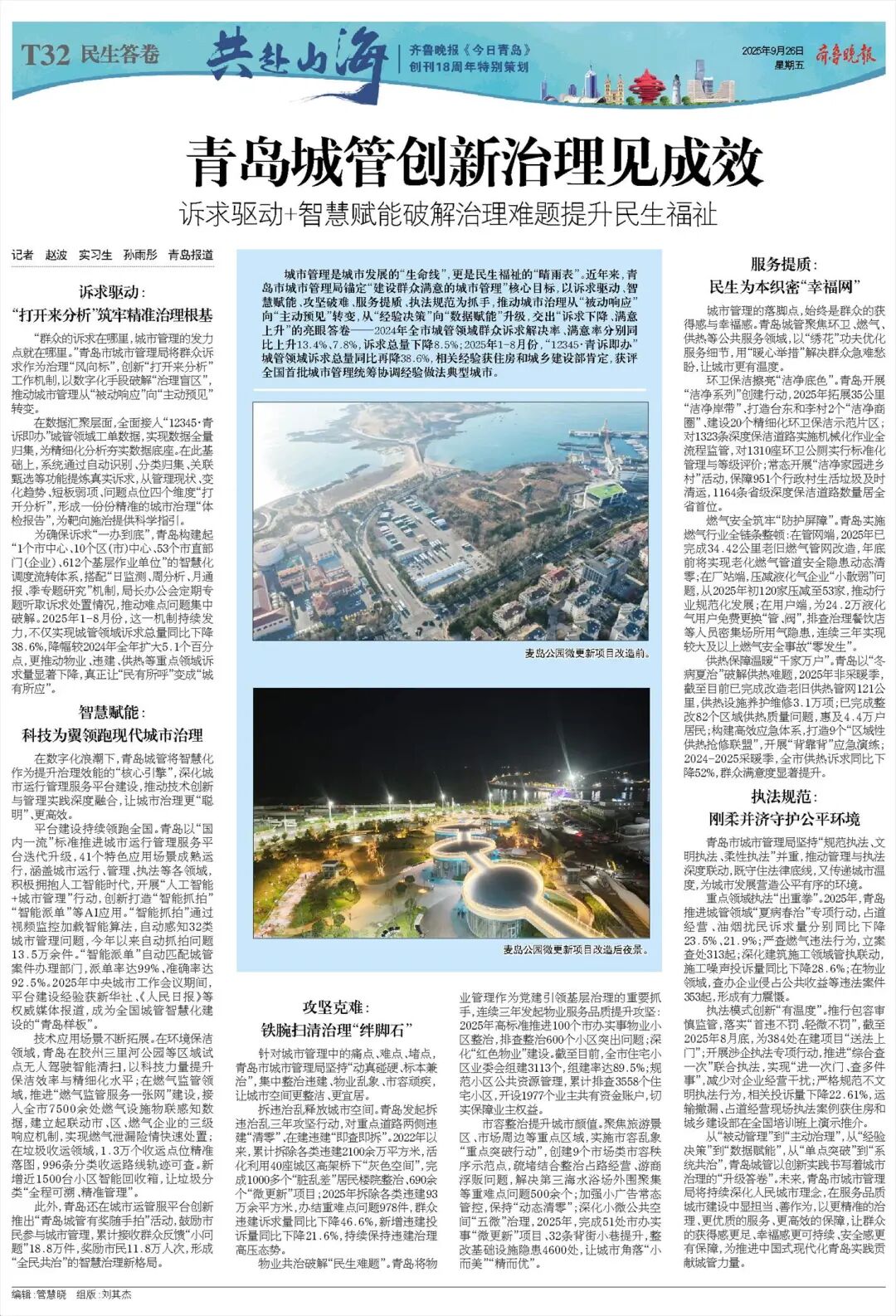 從“被動(dòng)管理”到“主動(dòng)治理”,從“經(jīng)驗(yàn)決策”到“數(shù)據(jù)賦能”,從“單點(diǎn)突破”到“系統(tǒng)共治”,青島城管以創(chuàng)新實(shí)踐書(shū)寫(xiě)著城市治理的“升級(jí)答卷”。未來(lái),青島市城市管理局將持續(xù)深化人民城市理念,在服務(wù)品質(zhì)城市建設(shè)中顯擔(dān)當(dāng)、善作為,以更精準(zhǔn)的治理、更優(yōu)質(zhì)的服務(wù)、更高效的保障,讓群眾的獲得感更足、幸福感更可持續(xù)、安全感更有保障,為推進(jìn)中國(guó)式現(xiàn)代化青島實(shí)踐貢獻(xiàn)城管力量。