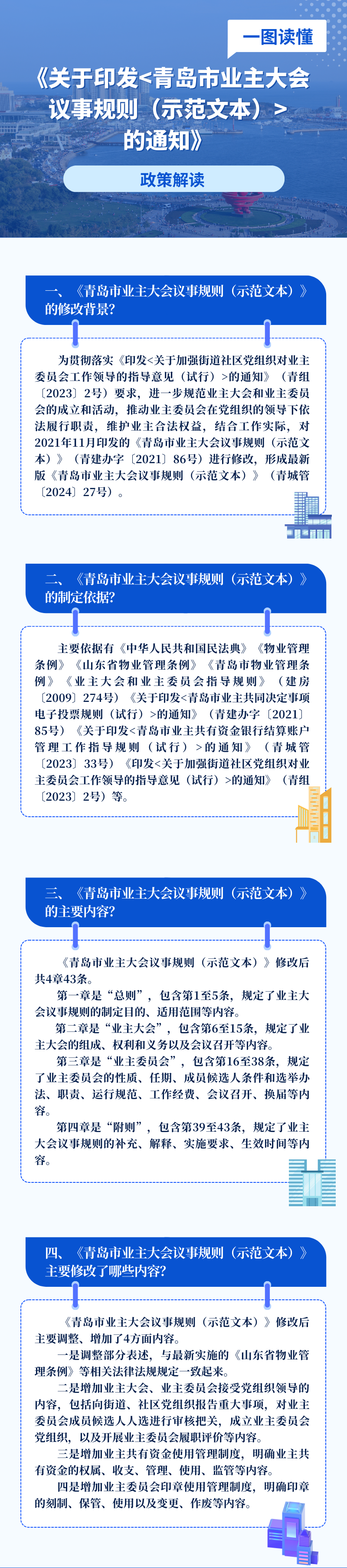 答:為貫徹落實(shí)《印發(fā)<關(guān)于加強(qiáng)街道社區(qū)黨組織對業(yè)主委員會工作領(lǐng)導(dǎo)的指導(dǎo)意見(試行)>的通知》(青組〔2023〕2號)要求,進(jìn)一步規(guī)范業(yè)主大會和業(yè)主委員會的成立和活動,推動業(yè)主委員會在黨組織的領(lǐng)導(dǎo)下依法履行職責(zé),維護(hù)業(yè)主合法權(quán)益,結(jié)合工作實(shí)際,對2021年11月印發(fā)的《青島市業(yè)主大會議事規(guī)則(示范文本)》(青建辦字〔2021〕86號)進(jìn)行修改,形成最新版《青島市業(yè)主大會議事規(guī)則(示范文本)》(青城管〔2024〕27號)。