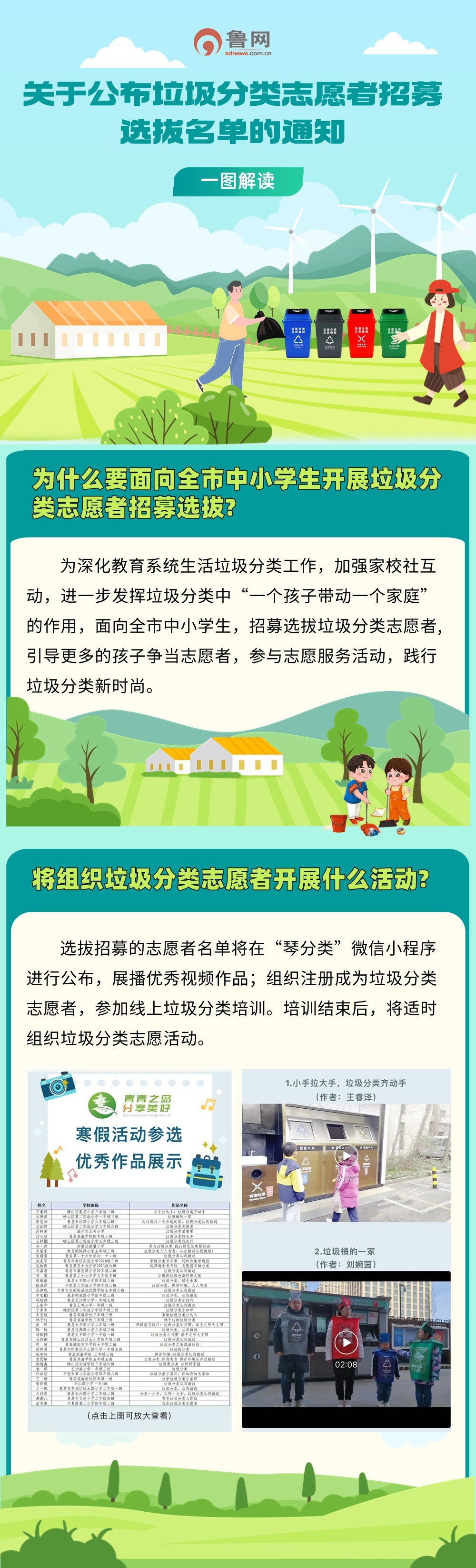 答:選拔招募的志愿者名單將在“琴分類”微信小程序進(jìn)行公布,展播優(yōu)秀視頻作品;組織注冊成為垃圾分類志愿者,參加線上垃圾分類培訓(xùn)。培訓(xùn)結(jié)束后,將適時組織垃圾分類志愿活動。