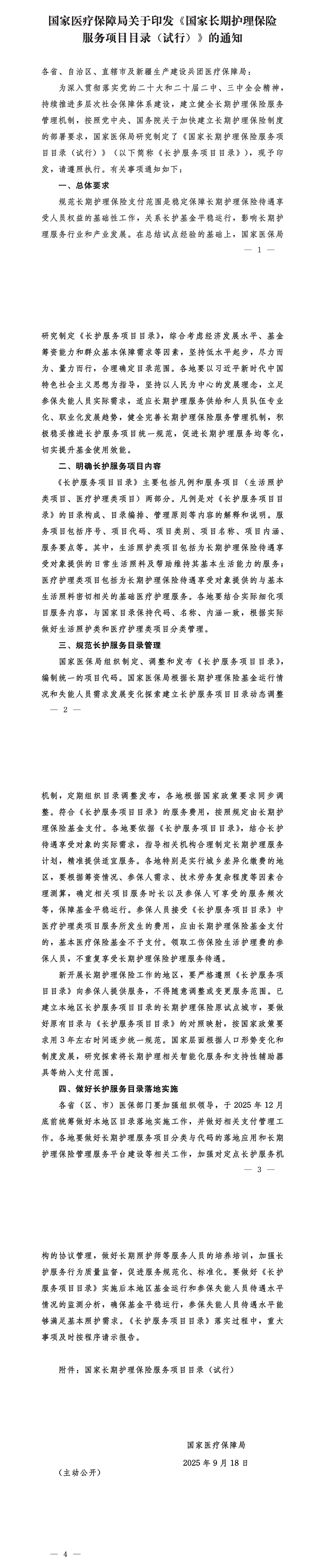 為深入貫徹落實(shí)黨的二十大和二十屆二中、三中全會(huì)精神,持續(xù)推進(jìn)多層次社會(huì)保障體系建設(shè),建立健全長(zhǎng)期護(hù)理保險(xiǎn)服務(wù)管理機(jī)制,按照黨中央、國(guó)務(wù)院關(guān)于加快建立長(zhǎng)期護(hù)理保險(xiǎn)制度的部署要求,國(guó)家醫(yī)保局研究制定了《國(guó)家長(zhǎng)期護(hù)理保險(xiǎn)服務(wù)項(xiàng)目目錄(試行)》(以下簡(jiǎn)稱《長(zhǎng)護(hù)服務(wù)項(xiàng)目目錄》),現(xiàn)予印發(fā),請(qǐng)遵照?qǐng)?zhí)行。有關(guān)事項(xiàng)通知如下: