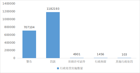 2.一個處罰決定書中包含一種行政處罰的,計入相應(yīng)的行政處罰類別欄中;包含兩種以上行政處罰類別的,計入最重的行政處罰類別欄中,不重復(fù)統(tǒng)計。如“沒收違法所得,并處罰款”,計入“沒收違法所得”類別;并處明確類別的行政處罰和其他行政處罰的,計入明確類別的行政處罰,如“處罰款,并處其他行政處罰”,計入“罰款”類別。行政處罰類別從輕到重的順序:(1)警告,(2)通報批評,(3)罰款,(4)沒收違法所得,(5)沒收非法財物,(6)暫扣許可證件,(7)降低資質(zhì)等級,(8)吊銷許可證件,(9)限制開展生產(chǎn)經(jīng)營活動,(10)責(zé)令停產(chǎn)停業(yè),(11)責(zé)令關(guān)閉,(12)限制從業(yè),(13)行政拘留。