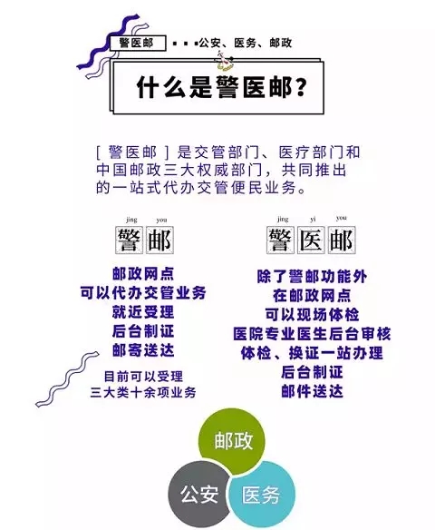 為有效減少人員聚集,防止疫情傳播,保障群眾生命安全,駕駛?cè)顺丝梢酝ㄟ^“網(wǎng)上辦、自助辦、延期辦”外,還可以就近選擇“警醫(yī)郵”郵政網(wǎng)點辦理,最最關(guān)鍵是不用再特地跑醫(yī)院體檢哦。