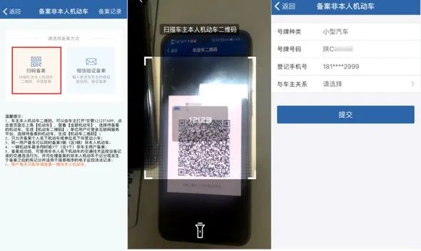 【備案方式:掃碼備案】對于個人名下的待備案機(jī)動車,車主用戶應(yīng)當(dāng)?shù)卿洝敖还?2123”APP,生成待備案機(jī)動車二維碼;對于待備案機(jī)動車為單位名下的,單位用戶需登錄互聯(lián)網(wǎng)平臺后選擇待備案機(jī)動車生成二維碼。二維碼生成后,需要備案該機(jī)動車的用戶使用“交管12123”APP掃碼。用戶掃碼驗證通過后,選擇與車主關(guān)系,提交備案申請。