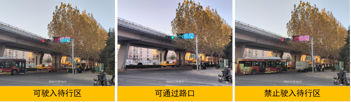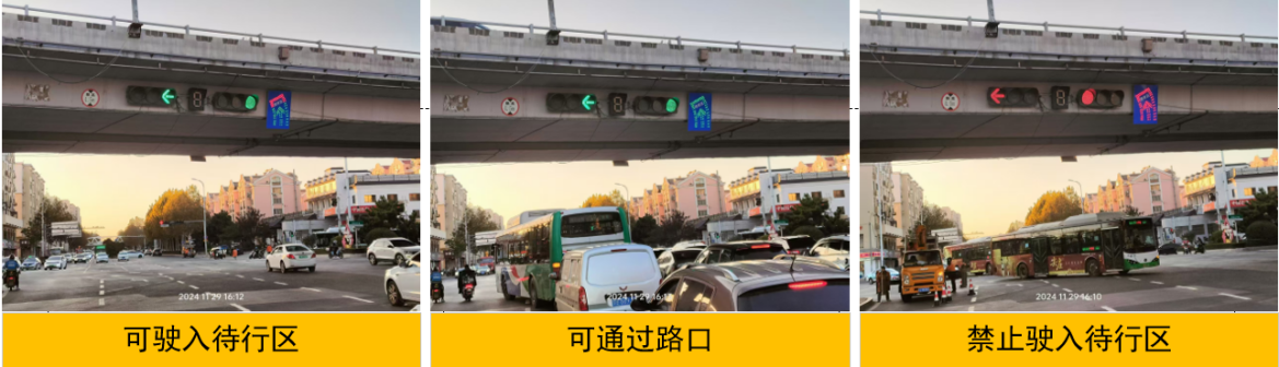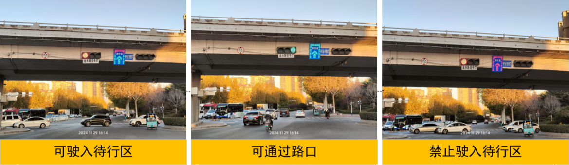 4.同步完善標(biāo)志標(biāo)線,增設(shè)待行區(qū)提示屏,引導(dǎo)駕駛員駛?cè)牒婉偝龃袇^(qū)。