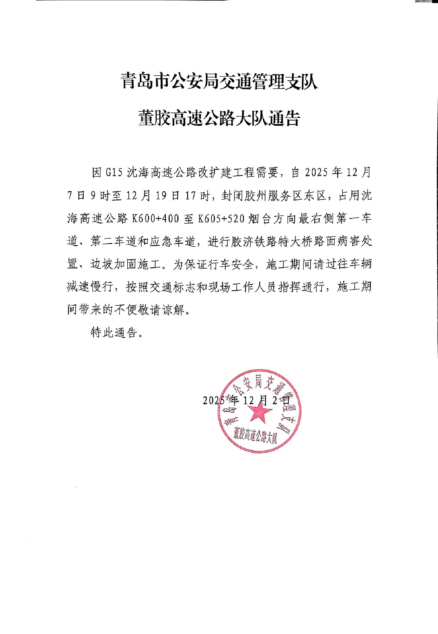 【施工公告】沈海高速公路K600至K605煙臺(tái)方向施工通告