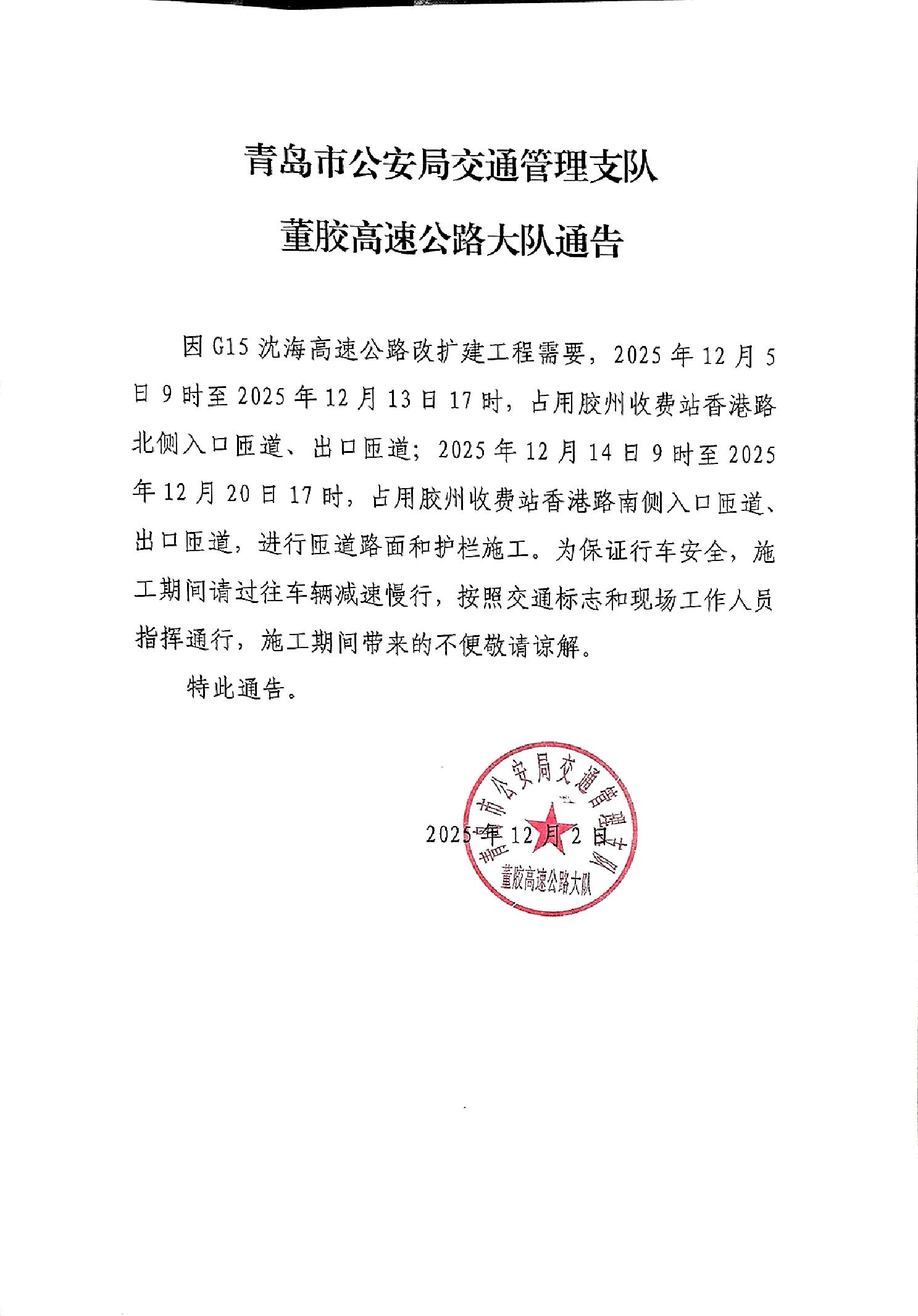 【施工公告】沈海高速公路膠州收費(fèi)站外廣場匝道施工通告