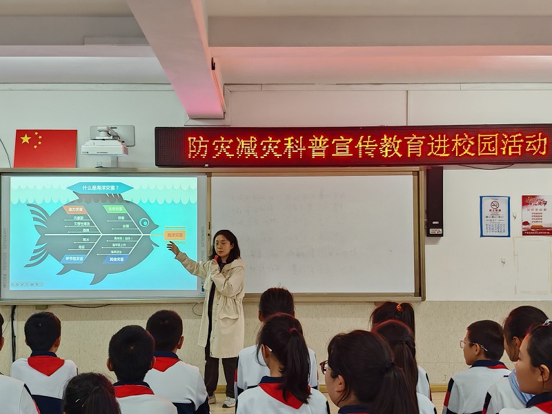 防災(zāi)減災(zāi)宣傳周期間,志愿者走進(jìn)北仲路第二小學(xué)的課堂,詳細(xì)講解了風(fēng)暴潮、海浪、海嘯、赤潮、裂流等海洋災(zāi)害現(xiàn)象、預(yù)警信號(hào)及科學(xué)避險(xiǎn)方法。針對(duì)青島沿海頻發(fā)的風(fēng)暴潮災(zāi)害和離岸流對(duì)青少年的潛在威脅,重點(diǎn)強(qiáng)調(diào)了識(shí)別災(zāi)害前兆、解讀預(yù)警信息和掌握應(yīng)急技能的重要性,引導(dǎo)樹立“知海、懂海、避險(xiǎn)于先”的安全意識(shí),提升應(yīng)急自護(hù)能力。