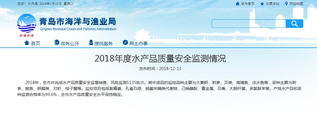 不斷做好水產(chǎn)品安全領域信息公開,暢通發(fā)布渠道,科學、客觀、準確、全面地公開水產(chǎn)品專項整治信息,及時發(fā)布水產(chǎn)品質(zhì)量監(jiān)督抽查結(jié)果。本年度,在青島政務網(wǎng)、我局門戶網(wǎng)站發(fā)布了《2018年上半年水產(chǎn)品質(zhì)量安全監(jiān)測情況》《上合(青島)峰會鮮活水產(chǎn)品供應基地》《2018年度水產(chǎn)品質(zhì)量安全監(jiān)測情況》,及各區(qū)市水產(chǎn)品質(zhì)量檢查情況等信息。