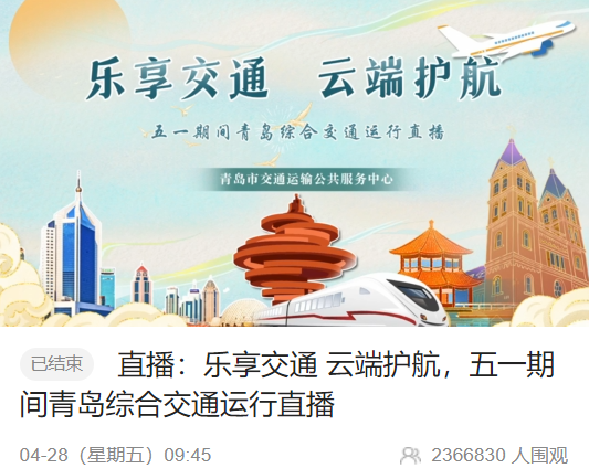 為保障2023年勞動節(jié)期間全市綜合交通運行平穩(wěn)、暢通,4月28日,市交通運輸公共服務中心聯(lián)合執(zhí)法支隊、山東高速集團、濟南局集團青島站、青島膠東國際機場建設有限公司等相關單位,組織開展了“樂享交通 云端護航”五一期間青島綜合交通運行網(wǎng)絡直播。直播持續(xù)時長45分鐘,觀看人次超過236萬。
