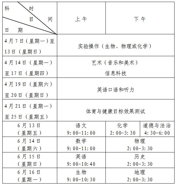 2022級學(xué)生考試科目:語文、數(shù)學(xué)、英語(含口語和聽力)、道德與法治、歷史、物理、化學(xué)、體育與健康、藝術(shù)(音樂和美術(shù))、實(shí)驗(yàn)操作(物理或化學(xué))。