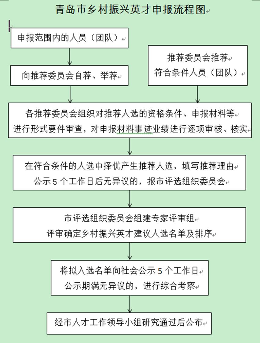 ?。ǘ┟鞔_了評(píng)選方法和程序?!掇k法》明確,青島市鄉(xiāng)村振興英才評(píng)選工作在市人才工作領(lǐng)導(dǎo)小組領(lǐng)導(dǎo)下,采取自薦、舉薦、推薦委員會(huì)推薦相結(jié)合的方式進(jìn)行。市委組織部、市農(nóng)業(yè)農(nóng)村局、市財(cái)政局、市人力資源社會(huì)保障局聯(lián)合組成青島市鄉(xiāng)村振興英才評(píng)選組織委員會(huì),負(fù)責(zé)具體實(shí)施工作。青島市鄉(xiāng)村產(chǎn)業(yè)振興工作專班、鄉(xiāng)村人才振興工作專班、鄉(xiāng)村文化振興工作專班、鄉(xiāng)村生態(tài)振興工作專班、鄉(xiāng)村組織振興工作專班、青島日?qǐng)?bào)社、青島市廣播電視臺(tái)成立7個(gè)推薦委員會(huì),負(fù)責(zé)青島市鄉(xiāng)村振興英才人選推薦。各推薦委員會(huì)根據(jù)評(píng)選維度標(biāo)準(zhǔn),推薦本專班、本領(lǐng)域人選;各市場(chǎng)主體、個(gè)人可向所在領(lǐng)域的工作專班推薦委員會(huì)自薦、舉薦人選,不得向青島日?qǐng)?bào)社、青島市廣播電視臺(tái)推薦委員會(huì)自薦、推薦。市評(píng)選組織委員會(huì)組建專家評(píng)審組,根據(jù)貢獻(xiàn)情況確定鄉(xiāng)村振興英才建議人選名單及排序。 鄉(xiāng)村振興英才申報(bào)流程詳見下圖。