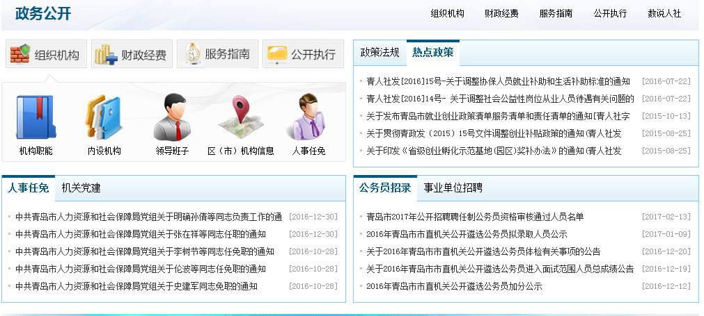 (一)推進(jìn)財政資金信息公開。我局重點公開了《2015年青島市人力資源和社會保障局“三公”經(jīng)費決算》及《2016年度青島市人力資源和社會保障局部門預(yù)算》,內(nèi)容涉及部門收支決算,“三公”經(jīng)費財政撥款支出決算等內(nèi)容。梳理全局100余項行政事業(yè)性收費項目,將收費標(biāo)準(zhǔn)和收費依據(jù)一次性向社會全部公開。