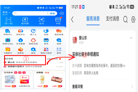 為提醒市民及時(shí)辦卡,近期,青島市人力資源和社會(huì)保障局將通過“支付寶”APP,為已在青島市參加社會(huì)保險(xiǎn)還未申領(lǐng)社??ǖ膮⒈H?,推送“實(shí)體社保卡申領(lǐng)通知”的提醒消息。市民在收到由青島市人社局推送的“您未辦理青島市社保卡,請(qǐng)及時(shí)辦理”的信息后,可直接點(diǎn)擊該提醒消息,系統(tǒng)將自動(dòng)跳轉(zhuǎn)到“愛山東”政務(wù)服務(wù)平臺(tái)→社會(huì)保障卡申領(lǐng)(成年人)頁面,市民可按照頁面指引辦理個(gè)人社??ㄉ觐I(lǐng),選擇“郵寄發(fā)卡”,受理銀行受理申請(qǐng)后,符合制卡條件的進(jìn)行制卡并免費(fèi)寄遞到家。