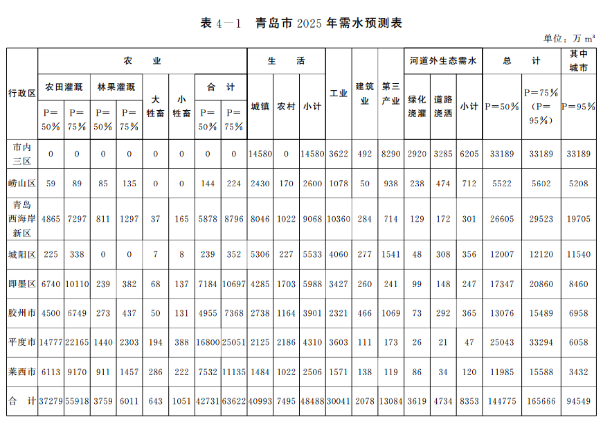 ?。ǘ┏鞘兴Y源配置。根據(jù)預測,2025年青島城市需水量為94549萬m3。