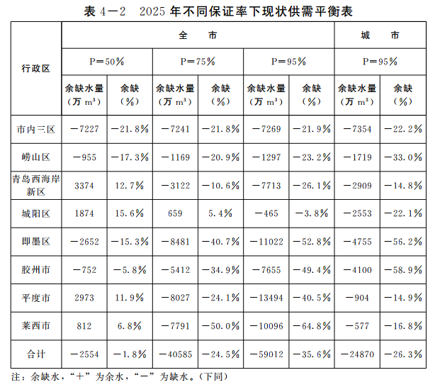 ?。ㄎ澹┤兴Y源平衡。到“十四五”末,通過加大客水引調(diào)、加大非常規(guī)水在全市供水中的貢獻率,在P=50%保證率下,全市供水大于需水,余水25.2%;在P=75%保證率下,全市需水大于供水,缺水率1.0%,即墨區(qū)、膠州市、平度市、萊西市因農(nóng)業(yè)需水量較大出現(xiàn)缺水,缺水率分別為15.1%、4.9%、9.9%和39.7%;在P=95%保證率下,全市需水大于供水,缺水率12.1%,青島西海岸新區(qū)、即墨區(qū)、膠州市、平度市、萊西市缺水率分別為3.5%、27.3%、19.4%、26.4%和54.4%。