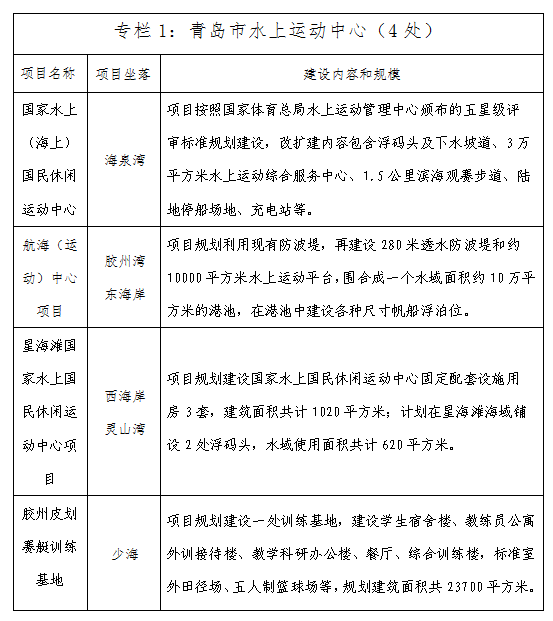 1.加快建設一批水上運動中心。以帆船、皮劃艇、摩托艇、槳板、沖浪、潛水等項目為引領,合理規(guī)劃專業(yè)訓練區(qū)和大眾休閑區(qū),改造一批專業(yè)水上運動訓練基地,開發(fā)一批水上休閑運動中心。支持在龍灣、靈山灣、唐家灣-薛家島、環(huán)膠州灣、東岸前海、嶗山風景區(qū)、鰲山灣、田橫等地區(qū)建設集旅游服務、運動娛樂、商業(yè)會展于一體的水上運動綜合體。在保障防洪安全、保護自然資源和生態(tài)環(huán)境的基礎上,充分利用即墨、膠州、萊西、平度、西海岸等公園水域、河流、湖泊等區(qū)域,重點建設一批便民利民的水上休閑運動設施。