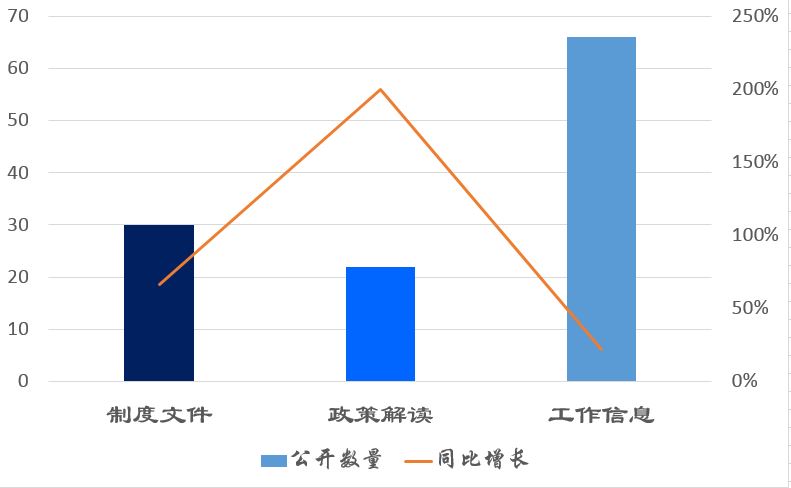堅持以公開為常態(tài)、不公開為例外的原則, 主動公開與公眾切身利益相關(guān)的政策文件,本年度發(fā)布制度文件30篇,同比增長66%;同步編制政策解讀文件22篇,同比增長200%;工作信息發(fā)布66篇,同比增長22%。