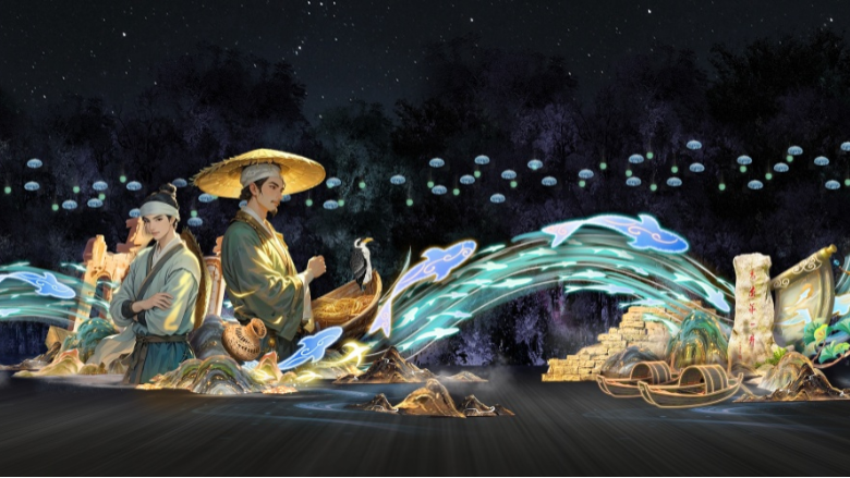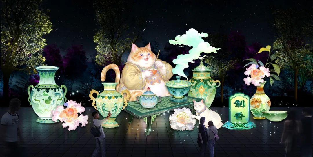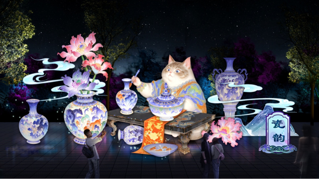 該區(qū)域位于北大草坪及以西部分區(qū)域,由“嶗韻流光”“漫步鮮花鎮(zhèn)”“機(jī)甲悟空”“瓷韻”“制香”“點(diǎn)茶”“書畫”“月闕云謠”等燈組組成。
